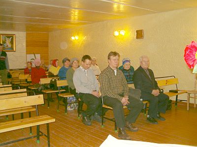 Meeting in the russian evangelic church in Kontuboga. In the front seat is sitting old russian preacher with black suit and besides
