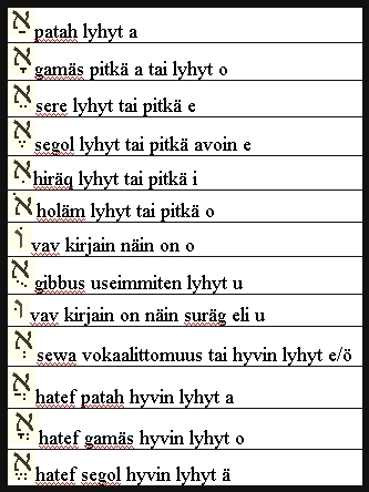 Hepreankielen vokaalimerkit ja niiden nimet sekä äännearvo