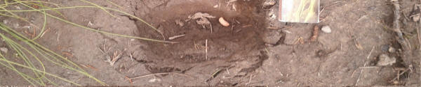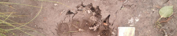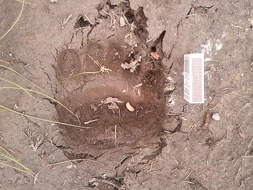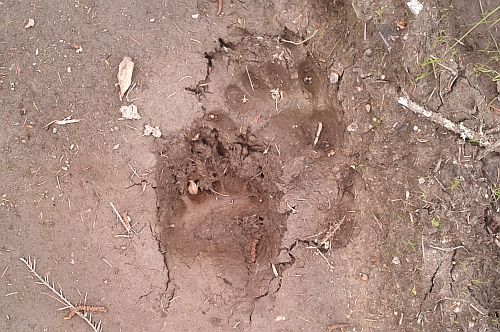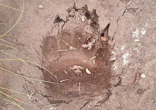 Karhun jälki metsään johtavalla savisella traktoritiellä.