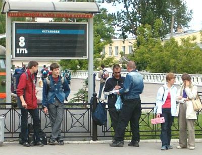 We distribute New Testaments and tracks in the streets of St. Petersburgh. This place is Finland railway station a place were trains