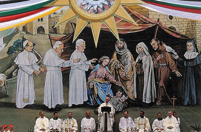 Bethelemin Manger Squaren seinämaalaus on palestiinan arabimuslimien ja katolisen kirkon propagandaa sekä vääristynyt kuvaus Jeesuksesta. Manger Squaren valheellinen seinämaalaus kertoo meille sen kuinka ekumenian kautta katolinen kirkko ja islaminusko ovat löytäneet keskinäisen yhteyden, joka tulee huipentumaan antikristuksen ilmestymiseen maan päälle, jonka niin katoliset kuin muslimit huutavat omaksi ja yhteiseksi messiaaksensa. Tässä kohden on syytä tuoda esille väkisin synnytetty käsite Palestiinan valtio ja palestiinalaiset, jolla tarkoitetaan Israelin valtion sisällä asuvia arabimuslimeita. Palestiinalaiset yrittävät kirjoittaa historiaa uudelleen, mutta historiaa vääristellen, sillä historiassa ei ole ollut valtiota nimeltä Palestiinaa ennen kuin se on nyt väkisin synnytetty, eikä Jeesus ollut palestiinalainen, vaan juutalainen. On olemassa väärään tietoon perustuva valhe, jonka mukaan muinaiset filistealaiset olisivat olleet Palestiinan arabeja, ja sen tähden Israel, joka on muinainen Palestiina kuuluisi Palestiinan arabeille. Monien tutkijoiden mukaan filistealaiset ovat olleet Egeanmeren kansaa, jotka ovat kulkeutuneet todennäköisesti Kreikasta tai Kreikkaan kuuluvalta Kreetan alueelta Lähi-itään. Raamattu sanoo Jer 47:4:ssa että filistealaisten alkuperä on Kaftorin saarelta. Kaftorin saari tarkoittaa nykyistä Kreetan saarta. Raamatun sanan todistuksen mukaan Lähi-idän muinaiset filistealaiset ovat olleet kreetalaisia, jotka tulivat Lähi-itään n. 1100 eKr. ja he asettuivat asumaan muinaisen Israelin maan Filistean meren rannikkoalueelle, jonka nimi on nykyään Välimeri. Sana filistealaiset on Raamatussa monikossa pelisthim, joka tulee sanasta pelisthi (pelesheth) ja tarkoittaa muukalaisia ja maahanmuuttajaa. Filistealaiset eivät olleet Israelin maan alueella ollut alkuperäiskansa, vaan Kreetalta tulleita valloittajia ja maahanmuuttajia. Muinaisilla filistealaisilla ei ollut etnistä ja historiallista yhteyttä muslimiarabien kanssa. Historia kumoaa väitteen, joka sanoo Israelin alueella olevien muslimiarabien olevan muinaisten filistealaisten jälkeläisiä. Sanat Palestiina ja palestiinalaiset polveutuu ja tulee sanoista Filistea ja filistealaiset, mutta kuten on tullut esille, niin filistealaiset olivat Kreetan saarelta tulleita maahanmuuttajia ja valloittajia, jotka valtasivat itselleen muinaisen Israelin maan rannikkoalueen (Filistean meri). Sanat Palestiina ja palestiinalaiset eivät viittaa mitenkään arabeihin tai muslimeihin. Sekin tulee muistaa, että muslimiuskonto syntyi vasta 600- luvulla jKr. Roomalaisten suorittaessa juutalaista kansanmurhaa muinaisessa Israelin maassa vuonna 70 jKr. niin roomalaiset julistivat ettei Israelia enää ole ja siksi maata kutsuttakoon Palestiinaksi. Roomalaisten julistuksesta huolimatta historiassa ei ole ollut Palestiinan valtion käsitettä ennen kuin se on nyt nykyään väkisin synnytetty. Roomalaiset nimittivät Israelin maa-aluetta Palestiinaksi, mutta eivät perustaneet sinne Palestiina nimistä valtiota. Vuoden 70 jKr. ajan jälkeen Israelin maa on ollut roomalaisten, bysanttilaisten, arabien, seljukkien, ristiretkeläisten, ammelukkien, turkkilaisen ottomaanien ja brittiläisen mandaattihallinnon alaisuudessa. Vuonna 1948 juutalaiset saivat takaisin oman muinaisen ja historiallisen kotimaansa. Kuuden päivän sodan (1967) seurauksena arabit hävisivät sodan Israelia vastaan, jonka jälkeen arabit alkoivat voimakkaasti korostamaan Palestiinan valtio ja Palestiinan arabi käsitteitä. Jordanian kuningas Abdullahin mukaan Palestiinassa asuvat arabit ja jordanialaiset olivat yksi kansa. Kuningas Abdullah vuonna 1950 kielsi Palestiina sanan käytön virallisissa dokumenteissa. Tämä historiallinen fakta ja yksityiskohta paljastaa sen ettei monien arabien keskuudessa ole ollut halukkuutta Palestiinan valtion syntymiseen Lähi-idän alueelle ennen vuotta 1967. Arabi historioitsija Abd Al-Ghani sanat todistavat myös sen, että Palestiinan valtio käsite on väkisin synnytetty käsite. Al-Ghadin mukaan ennen Balfourin julistusta 1917 ottomaanien (muslimihallinto) hallinnon (1517-1917) päättyessä ei ollut olemassa nykyajan Palestiinan poliittisia rajoja, eikä silloin ollut olemassa palestiinalaisia sellaisella poliittisella identiteetillä kuin nykyään on. Al-Ghanin mukaan Palestiinan hallinnolliset alueet sisälsivät Jordanian ja Länsi-Libanonin ja kun kaikki alueen ihmiset vapautettiin turkkilaisten ottomaanien vallasta, niin heidät välittömästi siirrettiin brittiläisen mandaattihallinnon alaisuuteen, eikä heille muodostunut mandaattihallinnon alaisuudessa palestiinalaisen kansan poliittista identiteettiä. Arabi historioitsijan lausunto tarkoittaa sitä, että poliittisen Palestiinan kansan identiteetti kehitettiin myöhemmin, Israelin itsenäistymisen aikoina. Palestiinan kansan poliittinen identiteetti on kehitetty sitä varten, että arabit saisivat lyömäaseen, jonka kautta he pyrkivät tuhoamaan juutalaisen kansan ja hävittämään Israelin pois maailmankartalta. Historia todistaa, että myös juutalaiset käyttivät nimitystä Palestiina. Vuonna 1932, juutalainen Gershon Agron perusti The Palestine Post sanomalehden. Vuonna 1950, lehden nimeksi tuli The Jerusalem Post. Vuonna 1936, juutalaisen Bronislaw Hubermanin johdolla perustettiin Palestiinan sinfoniaorkesteri. Vuonna 1948, orkesterin nimeksi tuli Israelin filharmoninen orkesteri. Vuonna 1923, juutalainen Pinhas Rutenberg perusti Palestiinan sähköyhtiön. Israelin itsenäistymisen jälkeen yhtiö otti käyttöön uuden nimen Israelin sähköyhtiö. Edellä olevat esimerkit juutalaisten omistuksessa olevasta sanomalehdestä, orkesterista ja sähköyhtiöstä todistavat sen, että nimitys Palestiina oli yleisesti käytössä kaikilla ihmisillä, jotka asuivat tuolla alueella. Tämä myös todistaa sen, että oli kyse Palestiina nimisestä maa-alueesta, ei erityisestä palestiinalaisesta kansasta, vaan ma