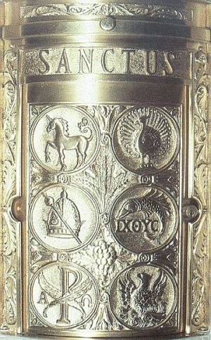 Logossa on aurinko, joka sulkee sisäänsä maan kaupungit. Rooman kirkko