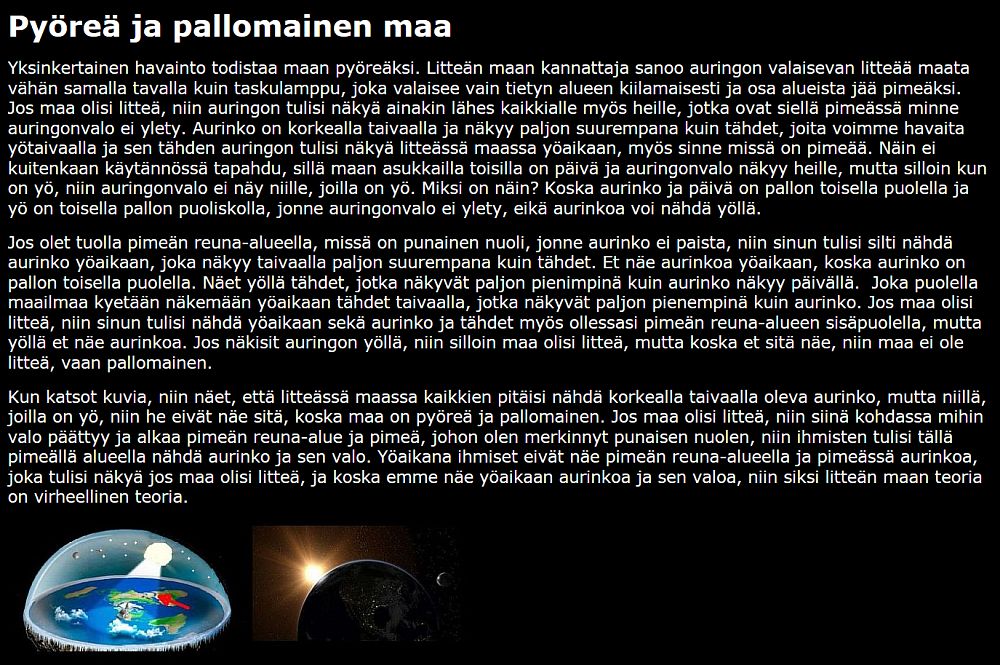 ja abortoitujen sikiösolujen rokote Pyöreä ja pallomainen maa Yksinkertainen havainto todistaa maan pyöreäksi. Litteän maan kannattaja sanoo auringon valaisevan litteää maata vähän samalla tavalla kuin taskulamppu, joka valaisee vain tietyn alueen kiilamaisesti ja osa alueista jää pimeäksi. Jos maa olisi litteä, niin auringon tulisi näkyä ainakin lähes kaikkialle myös heille, jotka ovat siellä pimeässä minne auringonvalo ei ylety. Aurinko on korkealla taivaalla ja näkyy paljon suurempana kuin tähdet, joita voimme havaita yötaivaalla ja sen tähden auringon tulisi näkyä litteässä maassa yöaikaan, myös sinne missä on pimeää. Näin ei kuitenkaan käytännössä tapahdu, sillä maan asukkailla toisilla on päivä ja auringonvalo näkyy heille, mutta silloin kun on yö, niin auringonvalo ei näy niille, joilla on yö. Miksi on näin? Koska aurinko ja päivä on pallon toisella puolella ja yö on toisella pallon puoliskolla, jonne auringonvalo ei ylety, eikä aurinkoa voi nähdä yöllä. Jos olet tuolla pimeän reuna-alueella, missä on punainen nuoli, jonne aurinko ei paista, niin sinun tulisi silti nähdä aurinko yöaikaan, joka näkyy taivaalla paljon suurempana kuin tähdet. Et näe aurinkoa yöaikaan, koska aurinko on pallon toisella puolella. Näet yöllä tähdet, jotka näkyvät paljon pienimpinä kuin aurinko näkyy päivällä. Joka puolella maailmaa kyetään näkemään yöaikaan tähdet taivaalla, jotka näkyvät paljon pienempinä kuin aurinko. Jos maa olisi litteä, niin sinun tulisi nähdä yöaikaan sekä aurinko ja tähdet myös ollessasi pimeän reuna-alueen sisäpuolella, mutta yöllä et näe aurinkoa. Jos näkisit auringon yöllä, niin silloin maa olisi litteä, mutta koska et sitä näe, niin maa ei ole litteä, vaan pallomainen. Kun katsot kuvia, niin näet, että litteässä maassa kaikkien pitäisi nähdä korkealla taivaalla oleva aurinko, mutta niillä, joilla on yö, niin he eivät näe sitä, koska maa on pyöreä ja pallomainen. Jos maa olisi litteä, niin siinä kohdassa mihin valo päättyy ja alkaa pimeän reuna-alue ja pimeä, johon olen merkinnyt punaisen nuolen, niin ihmisten tulisi tällä pimeällä alueella nähdä aurinko ja sen valo. Yöaikana ihmiset eivät näe pimeän reuna-alueella ja pimeässä aurinkoa, joka tulisi näkyä jos maa olisi litteä, ja koska emme näe yöaikaan aurinkoa ja sen valoa, niin siksi litteän maan teoria on virheellinen teoria.